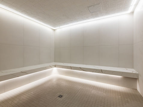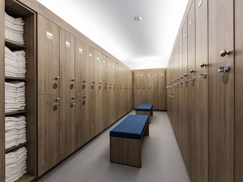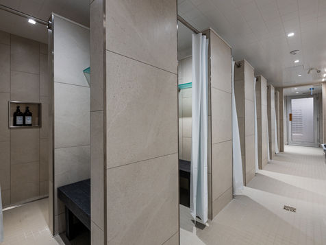 Covering 8,500 square feet, the locker rooms feature showers, whirlpools, saunas, steam rooms, lockers, changing areas, and restrooms.